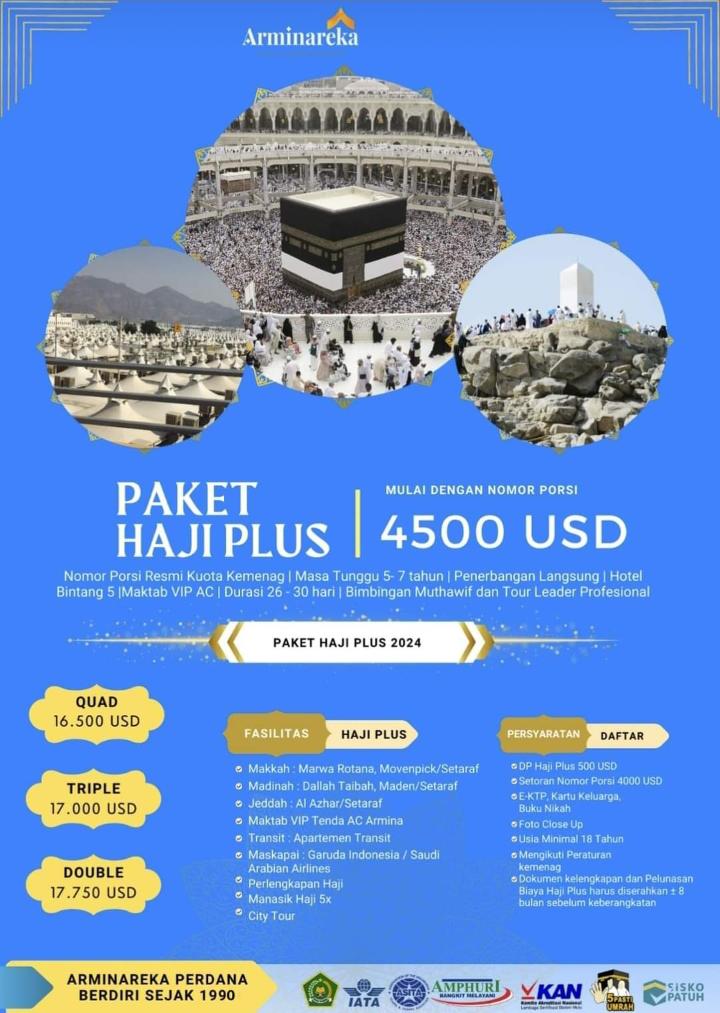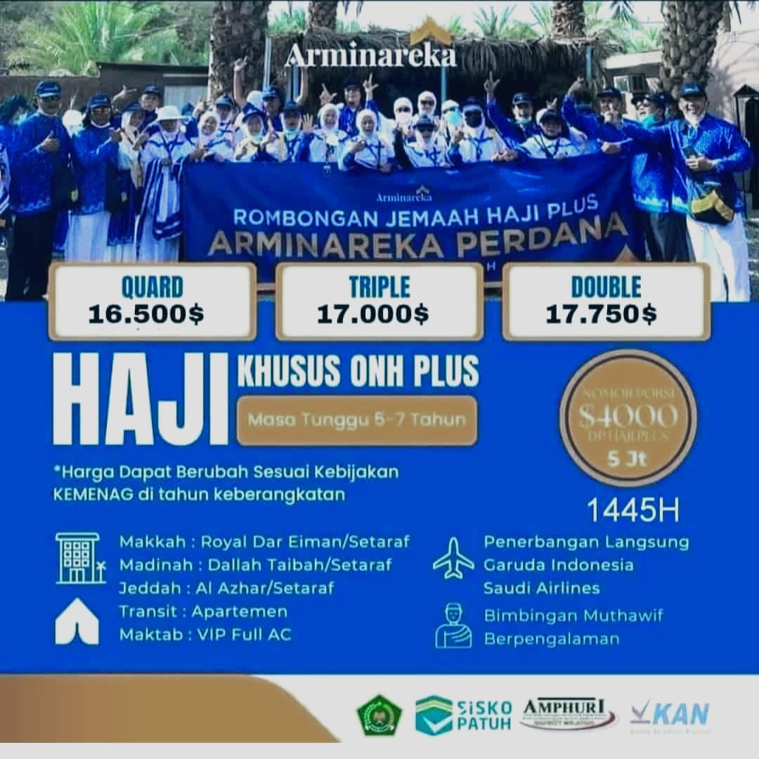 1 Kamar 2 Orang: $ 17.750, 1 Kamar 3 Orang: $ 17.000 & 1 Kamar 4 Orang: $ 16.500 | Masa tunggu 5-7 Tahun | Harga Dapat Berubah Sesuai Kebijakan KEMENAG di tahun keberangkatan.